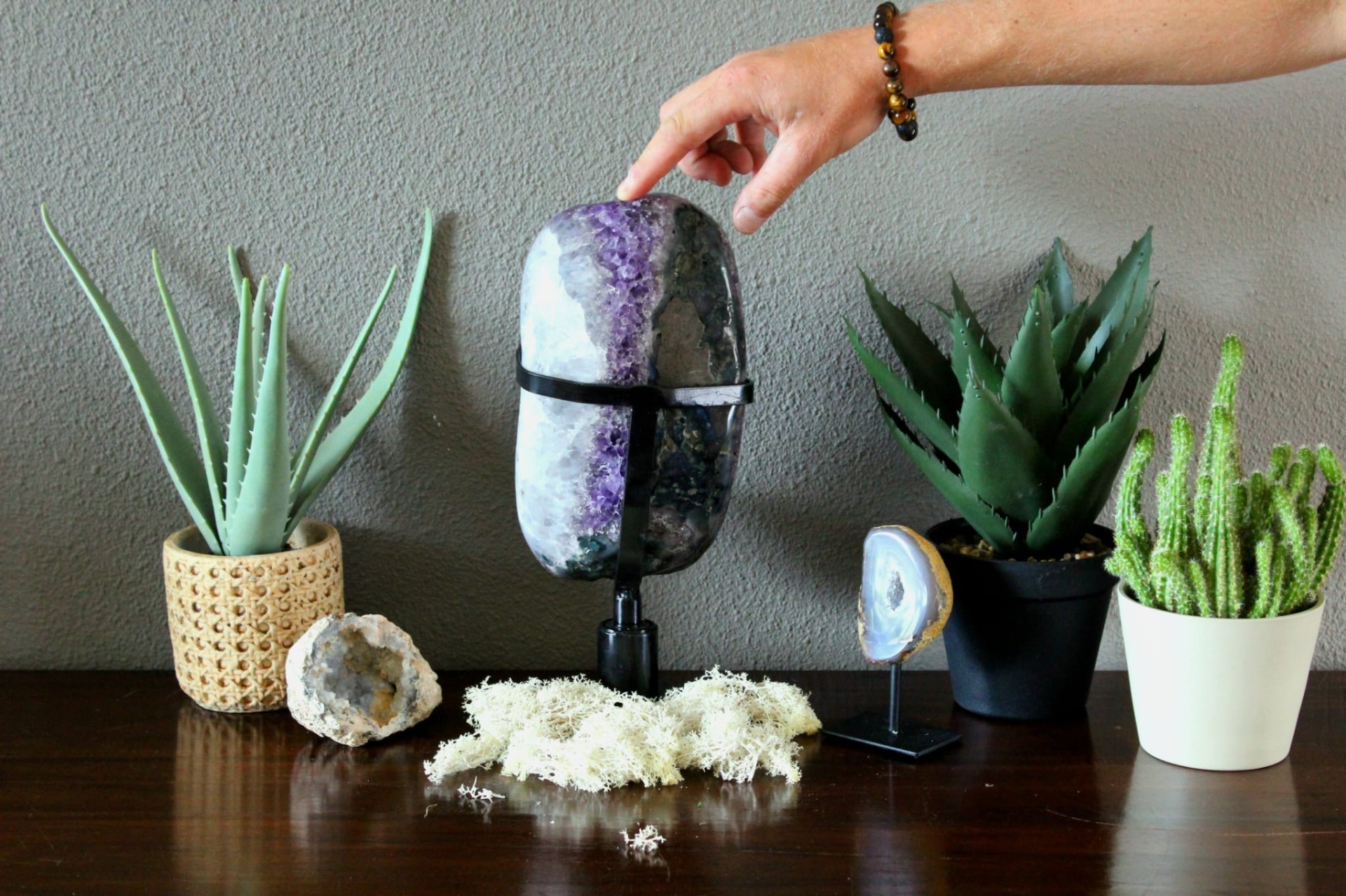 Dit bijzonder mooie stuk Amethist is van hoge kwaliteit. Hij is extra bijzonder door zijn prachtig geslepen achterzijde en de draaiende standaard maakt het een top stuk al decoratief stuk voor in huis of kantoor.